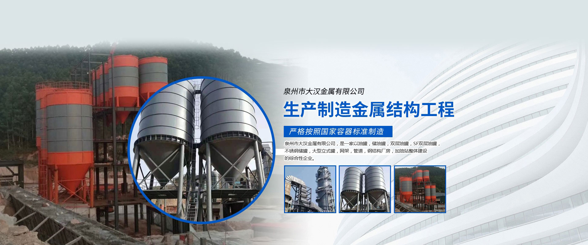 泉州市大漢金屬有限公司,是一家以油罐、儲油罐、雙層油罐、SF雙層油罐、不銹鋼儲罐、大型立式罐、網(wǎng)架、管道、鋼結(jié)構(gòu)廠房、加油站整體建設(shè)的綜合性企業(yè)。本公司以技術(shù)人員、施工經(jīng)驗(yàn)豐富的工程隊(duì)、自動化設(shè)備、擁有鋼結(jié)構(gòu)建筑、螺栓球網(wǎng)架設(shè)計(jì)安裝技術(shù)力量,嚴(yán)格按照國家容器標(biāo)準(zhǔn)制造,是一家產(chǎn)品開發(fā)并生產(chǎn)各種壓力容器和制造金屬結(jié)構(gòu)工程,化工石油工程安裝的大型企業(yè)。近多年來,以質(zhì)量穩(wěn)定、客戶至上、信譽(yù)為本,以科技求發(fā)展,贏得廣大客戶支持與信賴。